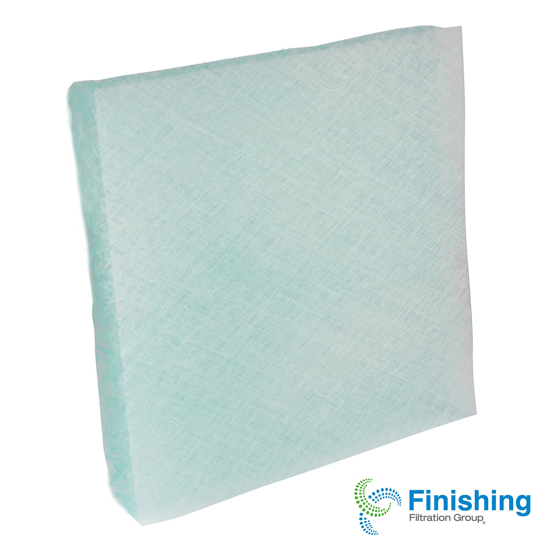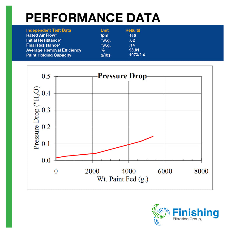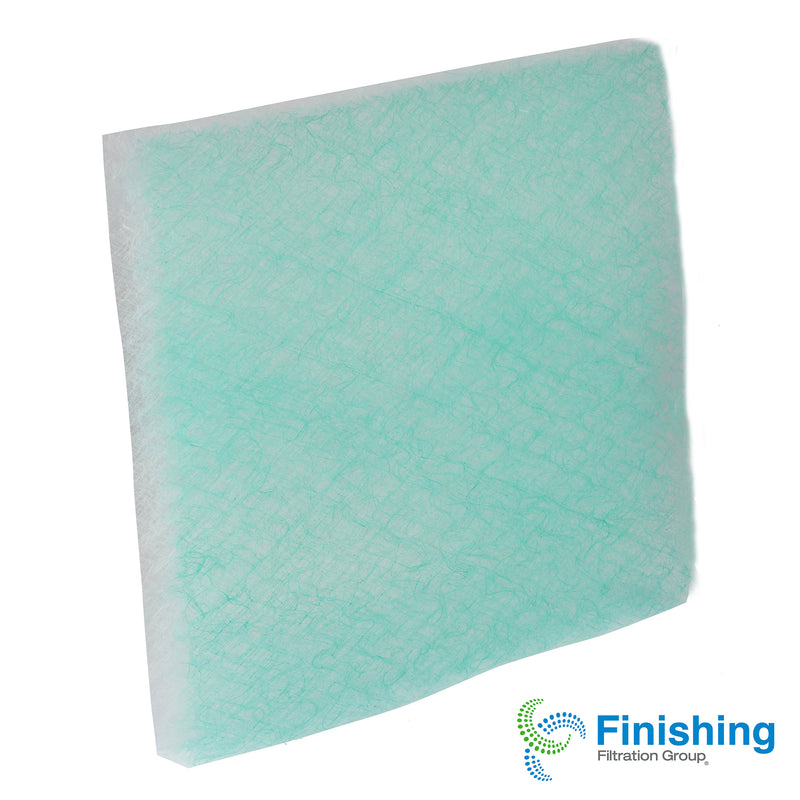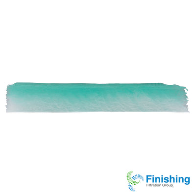 The 2" thick media is manufactured from continuous strands of glass fibers engineered to collect and retain a wide range of automotive and industrial-type coatings. The backing is a tightly woven 100% fiberglass construction allowing low initial static pressure. Air Enters White Side, Air Exits Green Side